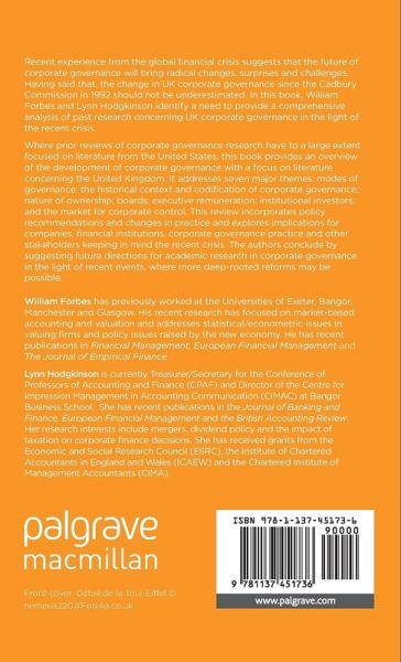 Recent experience from the global financial crisis suggests that the future of corporate governance will bring radical changes, surprises and challenges. Having said that, it should not be underestimated how much UK corporate governance has changed since the Cadbury Commission in 1992. In this book, William Forbes and Lynn Hodgkinson identify a need to provide a comprehensive analysis of past research concerning UK corporate governance in the light of the recent crisis. Where prior reviews of corporate governance research have to a large extent focused on literature from the USA, this book provides an overview of the development of corporate governance with a focus on literature concerning the UK. It addresses seven major themes: modes of governance; the historical context and codification of corporate governance; nature of ownership; boards; executive remuneration; institutional investors; and the market for corporate control. This review incorporates policy recommendations and changes in practice, and explores implications for companies, financial institutions, corporate governance practice and other stakeholders in the light of the recent crisis. The authors conclude by suggesting future directions for academic research in corporate governance in the light of recent events, where more deep rooted reform may be possible.