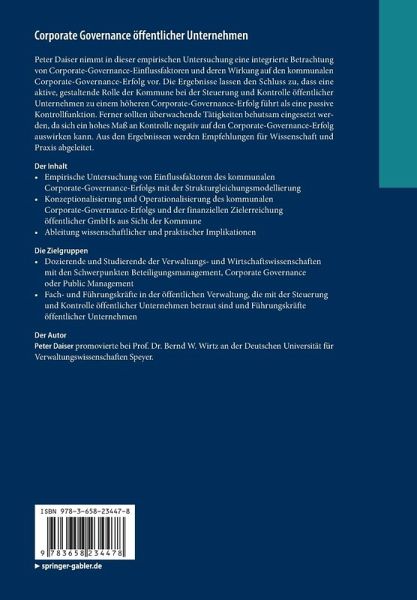 Peter Daiser nimmt in dieser empirischen Untersuchung eine integrierte Betrachtung von Corporate-Governance-Einflussfaktoren und deren Wirkung auf den kommunalen Corporate-Governance-Erfolg vor. Die Ergebnisse lassen den Schluss zu, dass eine aktive, gestaltende Rolle der Kommune bei der Steuerung und Kontrolle öffentlicher Unternehmen zu einem höheren Corporate-Governance-Erfolg führt als eine passive Kontrollfunktion. Ferner sollten überwachende Tätigkeiten behutsam eingesetzt werden, da sich ein hohes Maß an Kontrolle negativ auf den Corporate-Governance-Erfolg auswirken kann. Aus den Ergebnissen werden Empfehlungen für Wissenschaft und Praxis abgeleitet.