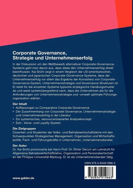 In der Diskussion um den Wettbewerb alternativer Corporate-Governance-Systeme geht man davon aus, dass diese den Unternehmenserfolg direkt beeinflussen. Kai Brühl zeigt in einem Vergleich der US-amerikanischen, deutschen und japanischen Corporate-Governance-Systeme, dass der Unternehmenserfolg vor allem das Ergebnis der Konsistenz von Corporate-Governance-System, Unternehmensstrategie und Governance-Strukturen ist. Er leitet für die einzelnen Systeme typische strategische Handlungsmuster ab und weist systemübergreifend nach, dass die Unternehmen die für die Anforderungen von Unternehmensstrategie und -umwelt optimale Führungsorganisation wählen.