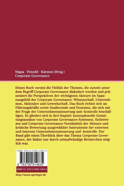 Dieses Buch vereint die Vielfalt der Themen, die zurzeit unter dem Begriff Corporate Governance diskutiert werden und präsentiert die Perspektiven der wichtigsten Akteure im Spannungsfeld der Corporate Governance: Wissenschaft, Unternehmen, Aktionäre und Gewerkschaft. Das Buch richtet sich an Führungskräfte sowie Studierende und Dozenten, die sich mit der Frage der Unternehmenssteuerung und -kontrolle beschäftigen. Es gliedert sich in drei Kapitel: konzeptionelle Gestaltungsansätze von Corporate Governance Systemen, Sichtweisen und Corporate Governance Verständnis der Akteure und kritische Bewertung ausgewählter Instrumente der externen und internen Unternehmenssteuerung und -kontrolle. Der Band gibt einen Überblick über das Thema Corporate Governance, der bisher nur durch zeitaufwändige Recherchen möglich war.