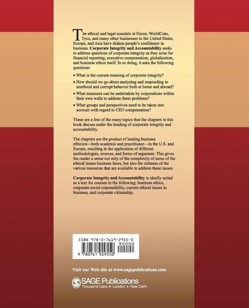 The ethical and legal scandals at Enron, WorldCom, Tyco and many other businesses in the United States, Europe and Asia have shaken people's confidence in business. Corporate Integrity and Accountability seeks to address questions of corporate integrity as they arise for financial reporting, executive compensation, globalization, and business ethics itself. The chapters are the product of leading business ethicists-both academic and practitioner-in the U.S. and Europe, resulting in the application of different methodologies, sources, and forms of argument. This gives the reader a sense not only of the complexity of some of the ethical issues business faces, but also the richness of the various resources that are available to address these issues.