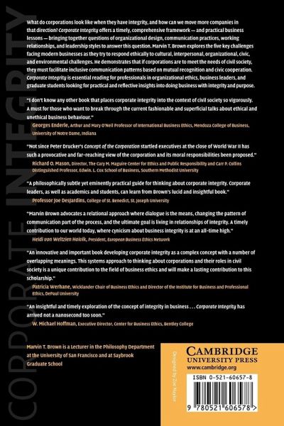 'When Kofi Annan claims that 'we are not asking corporations to do something different from their normal business; we are asking them to do their normal business differently', very few really know what this means. Marvin Brown succeeds in showing us how... Instead of looking at business from a moral or top down perspective, he employs civic perspectives that allow different voices to be heard, various perspectives and views to be voiced, and multiple futures to be discussed. He advocates a relational approach where dialogue is the means, changing the pattern of communication part of the process and the ultimate goal is living in relationships of integrity. A timely contribution to our world today, where cynicism about business integrity is at an all time high.' Heidi von Weltzien Hoivik, President, European Business Ethics Network
