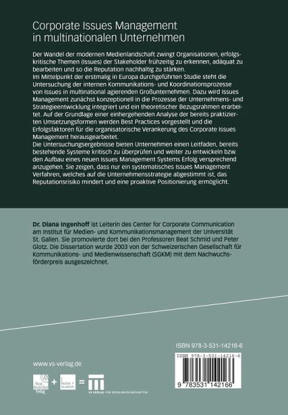 Im Mittelpunkt der erstmalig in Europa durchgeführten Studie steht die Untersuchung der internen Kommunikations- und Koordinationsprozesse von Issues in multinational agierenden Grossunternehmen. Dazu wird Issues Management zunächst konzeptionell in die Prozesse der Unternehmens- und Strategieentwicklung integriert und ein theoretischer Bezugsrahmen erarbeitet. Auf der Grundlage einer eingehenden Analyse der bereits praktizierten Umsetzungsformen werden Best Practices vorgestellt und die Erfolgsfaktoren für die organisatorische Verankerung des Corporate Issues Management herausgearbeitet.