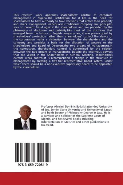 This research work appraises shareholders' control of corporate management in Nigeria.The justification for it lies in the need for shareholders to have authority to take decisions that affect their property and check management inadequacies.Traditional company law principles seek to prevent fraud against the shareholders and are pervaded by the philosophy of disclosure and publicity.Like most of the doctrines that emerged from the history of English company law, it was pre-occupied by shareholders' protection rather than shareholders' control.The device of the corporation marks a distinction between the shareholders and the company and provides a basis for the allocation of powers to the shareholders and Board of Directors,the two organs of management.In this connection, shareholders' control is determined by the relation between the two organs of management. Despite the enormous powers that are vested in the Shareholders in General Meeting, shareholders exercise weak control.Itis recommended a change in the structure of management by creating a two-tier representative board system, under which there should be a non-executive supervisory board to be appointed by the shareholders.