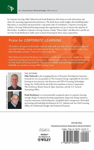 In Corporate Learning, Mike Dulworth and Frank Bordonaro offer down-to-earth information and advice for increasing organizational performance. The book shares useful insights about building leadership talent, as researched and presented by a top-notch cadre of contributors. Corporate Learning also outlines a five-step, field-tested learning strategy that organizations can use to increase the capacities of their leaders. In addition Corporate Learning contains a handy "Fitness Quiz" and illustrative real-life stories from Frank Bordonaro's stellar career as head of learning for three major corporations.