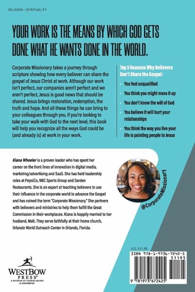 Corporate Missionary engages you with important and big questions regarding the Great Commission and your work life. The book weaves together stories of the authors career and how she began to overcome doubt, fear and pride to share the gospel with her colleagues and how you can too.