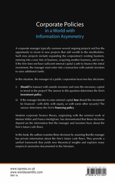 A corporate manager typically oversees several ongoing projects and has the opportunity to invest in new projects that add wealth to the stockholders. Such new projects include expanding the corporation's existing business, entering into a new line of business, acquiring another business, and so on. If the firm does not have sufficient internal capital (cash) to finance the initial investment, the manager must enter into a transaction with outside investors to raise additional funds. In this situation, the manager of a public corporation faces two key decisions: Should he transact with outside investors and raise the necessary capital to invest in the project? The answer to this question determines the firm's investment policy. If the manager decides to raise external capital how should the investment be financed — with debt, with equity, or with some other security? The answer determines the firm's financing policy. Modern corporate finance theory, originating with the seminal work of Merton Miller and Franco Modigliani, has demonstrated that these decisions depend on the information that the manager and investors have about the firm's future cash flows. In this book, the authors examine these decisions by assuming that the manager has private information about the firm's future cash flows. They provide a unified framework that yields new theoretical insights and explains many empirical anomalies documented in the literature.