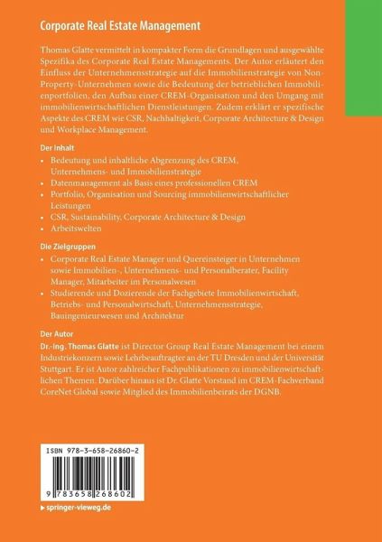 Thomas Glatte vermittelt in kompakter Form die Grundlagen und ausgewählte Spezifika des Corporate Real Estate Managements. Der Autor erläutert den Einfluss der Unternehmensstrategie auf die Immobilienstrategie von Non-Property-Unternehmen sowie die Bedeutung der betrieblichen Immobilienportfolien, den Aufbau einer CREM-Organisation und den Umgang mit immobilienwirtschaftlichen Dienstleistungen. Zudem erklärt er spezifische Aspekte des CREM wie CSR, Nachhaltigkeit, Corporate Architecture & Design und Workplace Management.