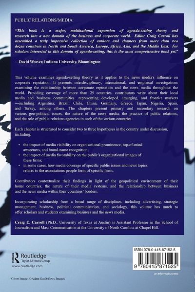 This volume examines agenda-setting theory as it applies to the news media's influence on corporate reputation. It presents interdisciplinary, international, and empirical investigations examining the relationship between corporate reputation and the news media throughout the world. Providing coverage of more than twenty-five countries, contributors write about their local media and business communities, representing developed, emerging, and frontier markets - including Argentina, Brazil, Chile, China, Germany, Greece, Japan, Nigeria, Spain, and Turkey, among others. The chapters present primary and secondary research on various geo-political issues, the nature of the news media, the practice of public relations, and the role of public relations agencies in each of the various countries.