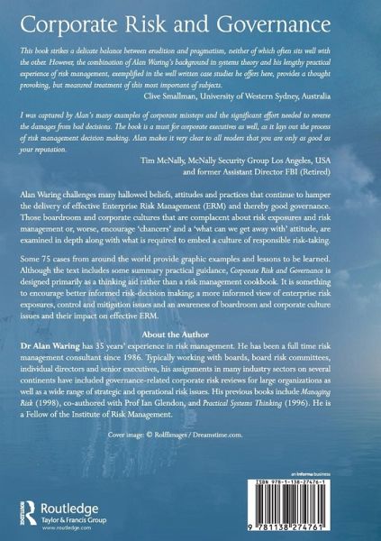 'Dr Alan Waring, a reflective practitioner with a solid academic base, set himself a main objective to write a book on corporate risk and governance that is accessible to the serious student and the practitioner with responsibility for the management of risk, as well as to senior managers generally. I believe he has achieved that objective. This book is predominantly a thinking aid rather than a raw prescriptive aid and is likely to inform and stimulate the interested reader. It provides a penetrating coverage of risk management and draws on a comprehensive published base, aided by his substantial experience as a consultant in strategic risk management in a variety of settings. The main settings are corporate governance, culture, due diligence, fraud/corruption, and intellectual property. The author pays particular attention to detail, with a strong analytical bias, and the book is well written. Also, the illustrative and case material is a real strength in highlighting the issues and principles that are addressed throughout the text.' Eugene McKenna, Emeritus Professor, University of East London, UK 'One of the author's declared objectives is to aid your thinking about risk management and corporate governance. This book certainly will do just that! The sheer number and variety of case studies will encourage the reader to assess the relevance of specific issues to their management of risk and to take appropriate action.' Christopher J Luck - Independent Risk Management Consultant 'Alan Waring is well qualified to write this book. He has written extensively on this topic including previous books and this is supplemented by academic study and a wealth of practical experience. The quality of the output reflects this. The book takes account of the global implications of ineffective corporate risk management and provides a guide to the causes of failures and potential remedies that can reduce risks across sectors and organisational types. The wi