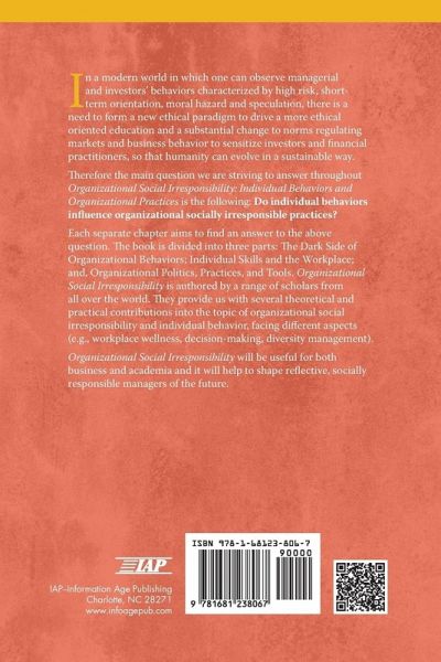 In a modern world in which one can observe managerial and investors' behaviors characterized by high risk, short term orientation, moral hazard and speculation, there is a need to form a new ethical paradigm to drive a more ethical oriented education and a substantial change to norms regulating markets and business behavior to sensitize investors and financial practitioners, so that humanity can evolve in a sustainable way. Therefore the main question we are striving to answer throughout the book "Organizational Social Irresponsibility: individual behaviors and organizational practices" is the following: Do individual behaviors influence organizational socially irresponsible practices? Each separate chapter aims to find an answer to the above question. The book is divided into three parts: first: "The dark side of organizational behaviors", second: "Individual skills and the workplace" and third: "Organizational politics, practices and tools. This book is authored by a range of authors from all over the world. They provide us with several theoretical and practical contributions into the topic of organizational social irresponsibility and individual behavior, facing different aspects (e.g. workplace wellness, decision-making, diversity management). We hope it will be useful for both business and academia and it will help to shape reflective, socially responsible managers of the future.