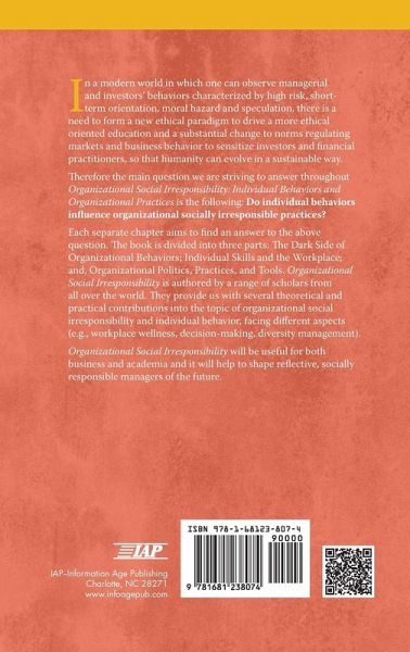 In a modern world in which one can observe managerial and investors' behaviors characterized by high risk, short term orientation, moral hazard and speculation, there is a need to form a new ethical paradigm to drive a more ethical oriented education and a substantial change to norms regulating markets and business behavior to sensitize investors and financial practitioners, so that humanity can evolve in a sustainable way. Therefore the main question we are striving to answer throughout the book "Organizational Social Irresponsibility: individual behaviors and organizational practices" is the following: Do individual behaviors influence organizational socially irresponsible practices? Each separate chapter aims to find an answer to the above question. The book is divided into three parts: first: "The dark side of organizational behaviors", second: "Individual skills and the workplace" and third: "Organizational politics, practices and tools. This book is authored by a range of authors from all over the world. They provide us with several theoretical and practical contributions into the topic of organizational social irresponsibility and individual behavior, facing different aspects (e.g. workplace wellness, decision¿making, diversity management). We hope it will be useful for both business and academia and it will help to shape reflective, socially responsible managers of the future.