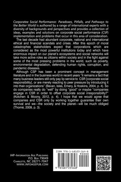 A volume in Contemporary Perspectives in Corporate Social Performance and Policy Series Editor Agata Stachowicz-Stanusch Corporatee Social Performance: Paradoxes- Pitfalls and Pathways to the Better World is authored by a range of international experts with a diversity of backgrounds and perspectives and provides a collection of ideas, examples and solutions on CSP implementation and problems that occur in this area of consideration. The last decade had abundant corporate, national and international ethical and financial scandals and crises. After this epoch of moral catastrophes stakeholders expect that corporations which are considered as the most powerful institutions today and which have enormous impact on our planet's ecosystems and social networks will take more active roles as citizens within society and in the fight against some of the most pressing problems in the world, such as poverty, environmental degradation, defending human rights, corruption, and pandemic diseases. Although Corporate Social Performance (CSP) has been a prominent concept in management literature and in the business world in recent years "it remains a fact that many business leaders still only pay lip service to CSR, or are merely reacting to peer pressure by introducing it into their organizations." (Bevan et al. 2004:4). So do really companies do "well" by doing "good" or maybe" companies engage in CSR in order to offset corporate social irresponsibility'? (Kotchen and Moony, 2012 p.4). I hope that we would agree that companies and CSR only by working together guarantee their own survival and we- the society and the planet -will be much obliged (Thomé, 2009 p. 3).