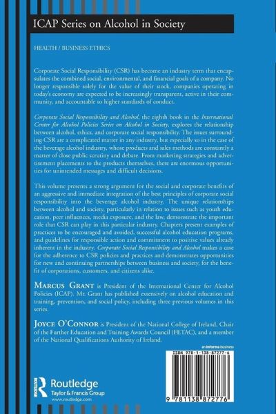 Increased scrutiny on the part of the general public, media, and government has warranted a reexamination of corporate responsibilities, standards of accountability, the company's role in its local and extended community, and its ethical position in our society and culture. Corporate Social Responsibility and Alcohol considers the basic values, ethics, policies and practices of a company's business. Particular attention will be paid to the alcohol beverage industry, and the many unique issues that are specific to this business, such as: responsible marketing, promotional, and advertising campaigns and strategies; the particular risks inherent in any alcoholic product; issues of abuse prevention & education; research; and legal and ethical aspects of alcohol. This will be the seventh volume in the ICAP Series on Alcohol in Society.
