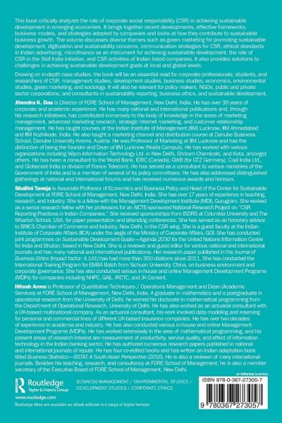 This book critically analyzes the role of corporate social responsibility (CSR) in achieving sustainable development in emerging economies. It brings together recent developments, effective frameworks, business models, and strategies adopted by companies and looks at how they contribute to sustainable business growth. The volume discusses diverse themes such as green marketing for promoting sustainable development; digitization and sustainability concerns; communication strategies for CSR; ethical standards in Indian advertising; microfinance as an instrument for achieving sustainable development; the role of CSR in the Skill India initiative; and CSR activities of Indian listed companies. It also provides solutions to challenges in achieving sustainable development goals at local and global levels. Drawing on in-depth case studies, the book will be an essential read for corporate professionals, students, and researchers of CSR, management studies, development studies, business studies, economics, environmental studies, green marketing, and sociology. It will also be relevant for policy makers, NGOs, public and private sector corporations, and consultants in sustainability reporting, business ethics, and sustainable development.