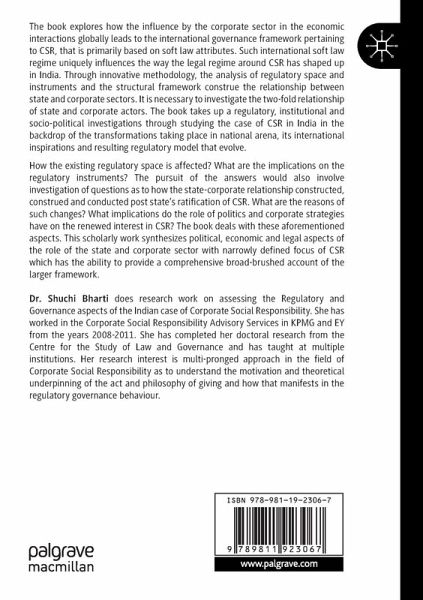 How the existing regulatory space is affected? What are the implications on the regulatory instruments? The pursuit of the answers would also involve investigation of questions as to how the state-corporate relationship constructed, construed and conducted post state's ratification of CSR. What are the reasons of such changes? What implications do the role of politics and corporate strategies have on the renewed interest in CSR? The book deals with these aforementioned aspects. This scholarly work synthesizes political, economic and legal aspects of the role of the state and corporate sector with narrowly defined focus of CSR which has the ability to provide a comprehensive broad-brushed account of the larger framework.