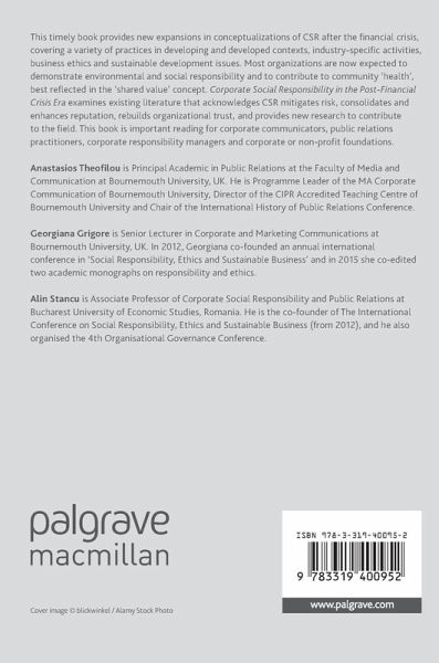Part 1: Corporate Responsibility in the "post" financial crisis: a moral discussion.- Chapter 1 Embedding social responsibility in HE corporate communications degrees. The place of CSR in teaching corporate communications programs (advertising, branding and public relations) (Rutherford and Richard Scullion).- Chapter 2 Does Religiousness Influence the Corporate Social Responsibility Orientation in Germany? (Maria Anne Schmidt).- Chapter 3 Responsibility in the Digital Economy (Georgiana Grigore, Mike Molesworth and Rebecca Watkins).- Chapter 4 A New Paradigm: How Social Movements Shape Corporate Social Responsibility after the Financial Crisis (Camelia Crisan and Ana Adi).- Chapter 5 An Ontologically Innovative Design of CSR Strategies: Enabling Value Added Institutional Collaborations (Fragkoulis A. Papagiannis).- Part 2: Corporate Responsibility in the "post" financial crisis: a need to institutionalize.- Chapter 6 Who is Ethical?: The Code of BusinessEthics in Korean Workplaces (Kyungmin Baek).- Chapter 7 CSR and banking morals - on the introduction of the Dutch Banker's Oath (Wybe T. Popma).- Chapter 8 Private-Public Sector Interaction in Terms of Crisis Management for Maintaining Sustainability and Enhancing CSR (Christina Nizamidou and Fotis Vouzas).- Chapter 9 The need for a responsible Public Administration (or) Extending CSR to Public Administration (Athanasios Chymis, Paolo D'Anselmi and Christos Triantopoulos).- Part 3: Corporate Responsibility in the "post" financial crisis: case studies.- Chapter 10 Exploring post-financial crisis CSR digital communications by MNEs in Mexico (María Castillo and Virginie Vial).- Chapter 11 Value chain and CSR of global pharmaceutical companies A framework to define practices (Nathalie Gimenes and Marielle A. Payaud).- Chapter 12 Fear, loathing and shale gas. The introduction of fracking to the UK: a case study (David McQueen).- Chapter 13 For-profits and Non-profits: A Research on the Collaboration's Premises during the Financial Crisis (Andreea Angela Von ea and Alin Stancu).