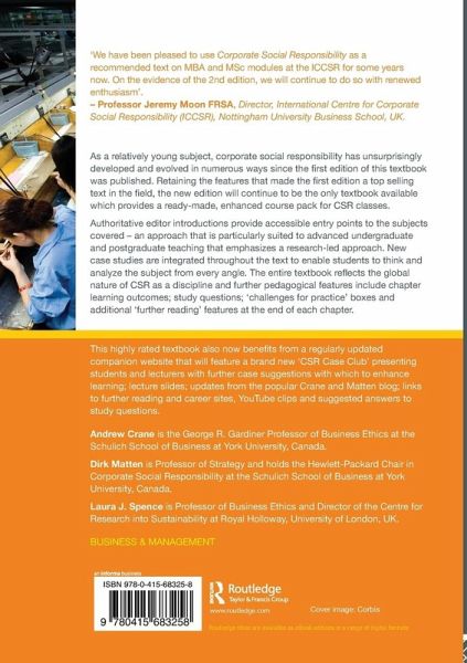 As a relatively young subject matter, corporate social responsibility has unsurprisingly developed and evolved in numerous ways since the first edition of this textbook was published. Retaining the features which made the first edition a top selling text in the field, the new edition continues to be the only textbook available which provides a ready-made, enhanced course pack for CSR classes. Authoritative editor introductions provide accessible entry points to the subjects covered - an approach which is particularly suited to advanced undergraduate and postgraduate teaching that emphasises a research-led approach. New case studies are integrated throughout the text to enable students to think and analyze the subject from every angle. The entire textbook reflects the global nature of CSR as a discipline and further pedagogical features include chapter learning outcomes; study questions; 'challenges for practice' boxes and additional 'further reading' features at the end of each chapter. This highly rated textbook now also benefits from a regularly updated companion website which features a brand new 'CSR Case Club' presenting students and lecturers with further case suggestions with which to enhance learning; lecture slides; updates from the popular Crane and Matten blog, links to further reading and career sites, YouTube clips and suggested answers to study questions. An Ivey CaseMate has also been created for this book at https://www.iveycases.com/CaseMateBookDetail.aspx?id=335.