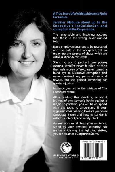 A True Story of a Whistleblower's Fight for Justice.Jennifer McGuire stood up to the Executive's intimidation and corruption at the Corporation. The remarkable and inspiring account that those in the wrong never wanted told. Every employee deserves to be respected and feel safe in the workplace, yet so many are the targets of abuse which we witness at pandemic levels. Standing up to protect two young women, Jennifer never buckled or took the hush money offered, never turned a blind eye to Executive corruption and never received any personal financial reward, but she gained something far greater - justice. Immerse yourself in the intrigue of The Corporate Storm. After reading this shocking personal journey of one woman's battle against a major Corporation, you will be equipped with the tools to understand if your organisation is heading towards your own Corporate Storm and how to survive it with your integrity and sanity intact. Awaken your mind. Build your resilience. Stand by your personal integrity. No matter which way the lightning strikes, you can weather a Corporate Storm.