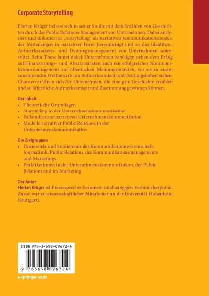 Florian Krüger befasst sich in seiner Studie mit dem Erzählen von Geschichten durch das Public Relations-Management von Unternehmen. Dabei analysiert und diskutiert er "Storytelling" als narrativen Kommunikationsmodus, der Mitteilungen in narrativer Form hervorbringt und so das Identitäts-, Aufmerksamkeits- und Deutungsmanagement von Unternehmen unterstützt. Seine These lautet dabei: Unternehmen benötigen neben dem Erfolg auf Finanzierungs- und Absatzmärkten auch ein erfolgreiches Kommunikationsmanagement auf öffentlichen Meinungsmärkten, wo sie in einem zunehmenden Wettbewerb um Aufmerksamkeit und Deutungshoheit stehen. Chancen eröffnen sich für Unternehmen, die eine gute Geschichte erzählen und so öffentliche Aufmerksamkeit und Zustimmung gewinnen können.