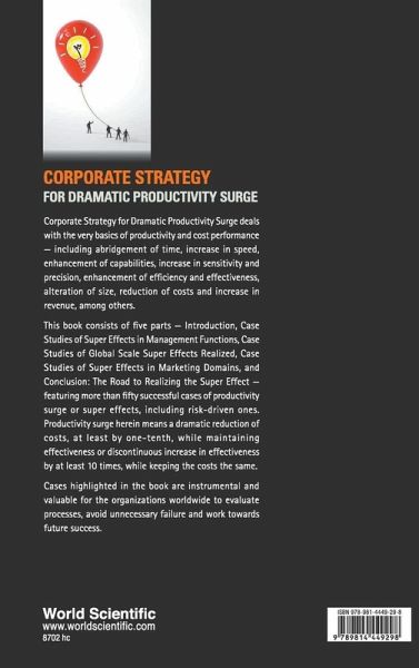 Corporate Strategy for Dramatic Productivity Surge deals with the very basics of productivity and cost performance including abridgement of time, increase in speed, enhancement of capabilities, increase in sensitivity and precision, enhancement of efficiency and effectiveness, alteration of size, reduction of costs and increase in revenue, among others. This book consists of five parts Introduction, Case Studies of Super Effects in Management Functions, Case Studies of Global Scale Super Effects Realized, Case Studies of Super Effects in Marketing Domains, and Conclusion: The Road to Realizing the Super Effect featuring more than fifty successful cases of productivity surge or super effects, including risk-driven ones. Productivity surge herein means a dramatic reduction of costs, at least by one-tenth, while maintaining effectiveness or discontinuous increase in effectiveness by at least 10 times, while keeping the costs the same. Cases highlighted in the book are instrumental and valuable for the organizations worldwide to evaluate processes, avoid unnecessary failure and work towards future success.