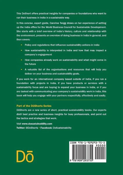 This short guide offers practical insights for companies or foundations who want to run their business in India in a sustainable way.In this concise, expert guide, Caroline Twigg draws on her experience of setting up the India office for the World Business Council for Sustainable Development. She starts with a brief overview of India's history, culture and relationship with the environment, presents an overview of doing business in India in general, and then covers: policy and regulations that influence sustainability actions in India; how sustainability is interpreted in India and how that may impact a company's engagement; how companies already work on sustainability and what might come in the future; a valuable list of the organizations and resources that will help you deliver on your business and sustainability goals. If you work for an international company based outside of India, if you run a foundation with projects in India, if you have products or services with a sustainability focus and are hoping to expand your business in India, or if you are tasked with communicating your company's sustainability work in India, this book will help you engage with your partners respectfully, effectively and easily.