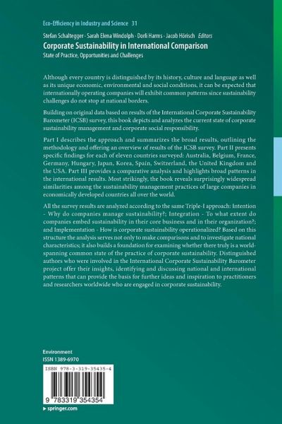 All the survey results are analyzed according to the same Triple-I approach: Intention - Why do companies manage sustainability?; Integration - To what extent do companies embed sustainability in their core business and in their organization? And Implementation - How is corporate sustainability operationalized? Based on this structure the analysis serves not only to make comparisons and to investigate national characteristics; it also builds a foundation for examining whether there truly is a world-spanning common state of the art of corporate sustainability. Distinguished authors who were involved in the International Corporate Sustainability Barometer project offer their insights, identifying and discussing national and international patterns that can provide the basis for further ideas and inspiration topractitioners and researchers worldwide who are engaged in corporate sustainability.