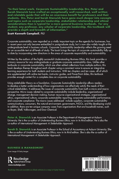 "In their latest work, Corporate Sustainability Leadership, Drs. Peter and Sarah Stanwick have crafted an exceptionally well researched, well written and relatable guide that will be an enormous benefit for professors and their students. Drs. Peter and Sarah Stanwick have gone much deeper into concepts and topics such as corporate leadership, stakeholder relationship and ethical considerations than is typical for a more general business textbook. For any student, any professor, any scholar of corporate leadership, this textbook will provide a depth and breadth of information." - Scott Kenneth Campbell, PhD