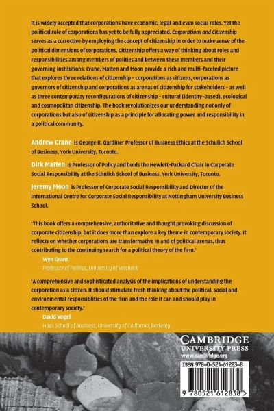 It is widely accepted that corporations have economic, legal, and even social roles. Yet the political role of corporations has yet to be fully appreciated. Corporations and Citizenship serves as a corrective by employing the concept of citizenship in order to make sense of the political dimensions of corporations. Citizenship offers a way of thinking about roles and responsibilities among members of polities and between these members and their governing institutions. Crane, Matten and Moon provide a rich and multi-faceted picture that explores three relations of citizenship - corporations as citizens, corporations as governors of citizenship, and corporations as arenas of citizenship for stakeholders - as well as three contemporary reconfigurations of citizenship - cultural (identity-based), ecological, and cosmopolitan citizenship. The book revolutionizes not only our understanding of corporations but also of citizenship as a principle of allocating power and responsibility in a political community.