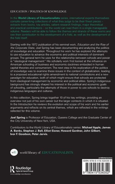 Starting with the 1972 publication of his seminal work, Education and the Rise of the Corporate State, Joel Spring has been documenting and analyzing the politics of knowledge and education. Throughout his work he has explored the attempts to use education to advance the economic and political interests of dominant groups. The general term he uses for the relationship between schools and power is "ideological management." His scholarly work first looked at the influence on American schooling of business and economic doctrines embodied in human capital theories and consumerism. The next step in his exploration of the politics of knowledge was to examine these issues in the context of globalization, leading to a proposed educational rights amendment to national constitutions and a new paradigm for education, both of which might ensure that schools are protected from ideological management by economic and political elites. Spring's indigenous background has strongly shaped his interest in the political and economic goals of schooling, particularly the attempts of those in power to use schools to destroy indigenous languages and cultures. In this collection, Spring brings together 10 of his key writings, providing an overview not just of his own career but the larger contexts in which it is situated. In the Introduction he reviews the evolution and scope of his work and his earlier arguments and reflects on its central themes, which are reflected in the writings selected for this volume. In the World Library of Educationalists, international scholars themselves compile career-long collections of what they judge to be their finest pieces - extracts from books, key articles, salient research findings, major theoretical and/practical contributions - so the world can read them in a single manageable volume. Readers will be able to follow the themes and strands of their work and see their contribution to the development of a field, as well as the development of the field itself. Contributors to the series include: Michael Apple, James A. Banks, Stephen J. Ball, Elliot Eisner, Howard Gardner, John Gilbert, Ivor F. Goodson, Peter Jarvis.