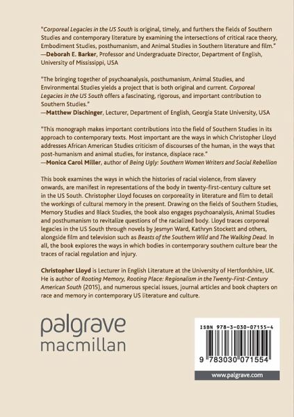This book examines the ways in which the histories of racial violence, from slavery onwards, are manifest in representations of the body in twenty-first-century culture set in the US South. Christopher Lloyd focuses on corporeality in literature and film to detail the workings of cultural memory in the present. Drawing on the fields of Southern Studies, Memory Studies and Black Studies, the book also engages psychoanalysis, Animal Studies and posthumanism to revitalize questions of the racialized body. Lloyd traces corporeal legacies in the US South through novels by Jesmyn Ward, Kathryn Stockett and others, alongside film and television such as Beasts of the Southern Wild and The Walking Dead. In all, the book explores the ways in which bodies in contemporary southern culture bear the traces of racial regulation and injury.