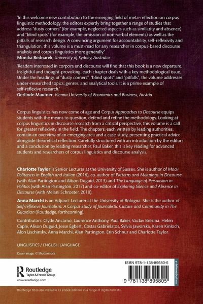 Charlotte Taylor is Senior Lecturer at the University of Sussex. She is author of Mock Politeness in English and Italian (2016), co-author of Patterns and Meanings in Discourse (with Alan Partington and Alison Duguid, 2013) and The Language of Persuasion in Politics (with Alan Partington, 2017) and co-editor of Exploring Silence and Absence in Discourse (with Melani Schroeter, 2018). Anna Marchi is an Adjunct Lecturer at the University of Bologna. She is the author of Self-reflexive Journalism: A Corpus Study of Journalistic Culture and Community in The Guardian (Routledge, forthcoming).