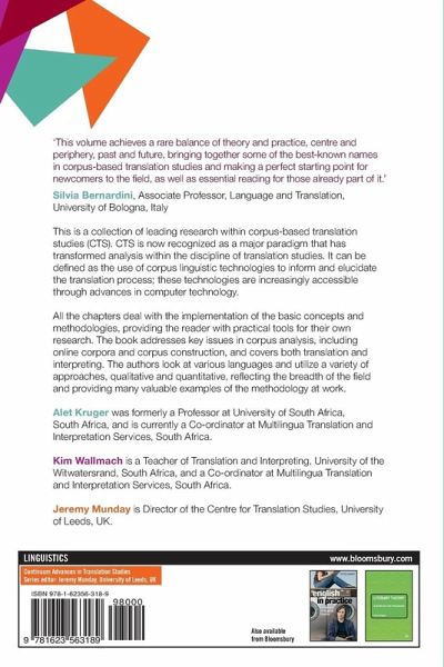 This is a collection of leading research within corpus-based translation studies (CTS). CTS is now recognized as a major paradigm that has transformed analysis within the discipline of translation studies. It can be defined as the use of corpus linguistic technologies to inform and elucidate the translation process, something that is increasingly accessible through advances in computer technology. The book pulls together a wide range of perspectives from respected authors in the field. All the chapters deal with the implementation of the basic concepts and methodologies, providing the reader with practical tools for their own research. The book addresses key issues in corpus analysis, including online corpora and corpus construction, and covers both translation and interpreting. The authors look at various languages and utilize a variety of approaches, qualitative and quantitative, reflecting the breadth of the field and providing many valuable examples of the methodology at work.