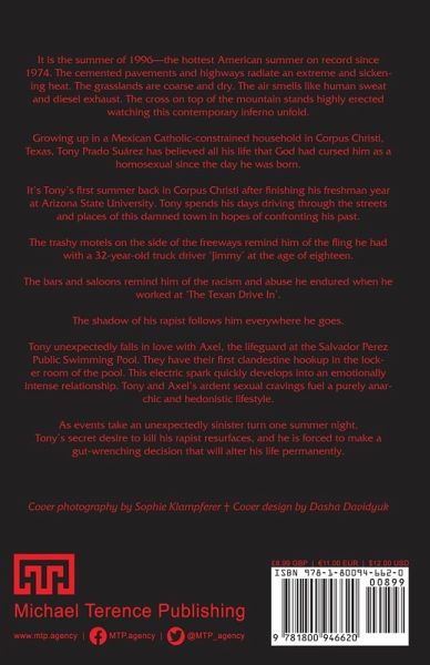 It is the summer of 1996-the hottest American summer on record since 1974. The cemented pavements and highways radiate an extreme and sickening heat. The grasslands are coarse and dry. The air smells like human sweat and diesel exhaust. The cross on top of the mountain stands highly erected watching this contemporary inferno unfold. Growing up in a Mexican Catholic-constrained household in Corpus Christi, Texas, Tony Prado Suárez has believed all his life that God had cursed him as a homosexual since the day he was born. It's Tony's first summer back in Corpus Christi after finishing his freshman year at Arizona State University. Tony spends his days driving through the streets and places of this damned town in hopes of confronting his past. The trashy motels on the side of the freeways remind him of the fling he had with a 32-year-old truck driver 'Jimmy' at the age of eighteen. The bars and saloons remind him of the racism and abuse he endured when he worked at 'The Texan Drive-In'. The shadow of his rapist follows him everywhere he goes. Tony unexpectedly falls in love with Axel, the lifeguard at the Salvador Perez Public Swimming Pool. They have their first clandestine hookup in the locker room of the pool. This electric spark quickly develops into an emotionally intense relationship. Tony and Axel's ardent sexual cravings fuel a purely anarchic and hedonistic lifestyle. As events take an unexpectedly sinister turn one summer night, Tony's secret desire to kill his rapist resurfaces, and he is forced to make a gut-wrenching decision that will alter his life permanently.