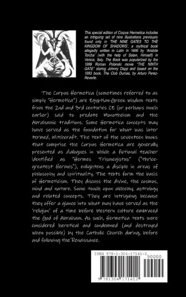 The Corpus Hermetica (sometimes referred to as simply "Hermetica") are Egyptian-Greek wisdom texts from the 2nd and 3rd centuries CE (or perhaps much earlier) said to predate Monotheism and the Abrahamic traditions. Some Hermetica concepts may have served as the foundation for what was later termed, Witchcraft. This special edition of Corpus Hermetica includes an intriguing set of illustrations including nine previously found only in 'THE NINE GATES TO THE KINGDOM OF SHADOWS', a mythical book allegedly written in Latin in 1666 by 'Aristide Torcha' (with the help of Satan, Himself) in Venice, Italy. The Book was popularized by the 1999 Roman Polanski movie "THE NINTH GATE" staring Johnny Depp and based on the 1993 book, The Club Dumas, by Arturo Perez-Reverte. NOTE: THIS HARDCOVER EDITION HAS NO DUST JACKET.