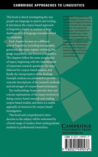 This book is about investigating the way people use language in speech and writing. It introduces the corpus-based approach to linguistics, based on analysis of large databases of real language examples stored on computer. Each chapter focuses on a different area of linguistics, including lexicography, grammar, discourse, register variation, language acquisition, and historical linguistics. Example analyses are presented in each chapter to provide concrete descriptions of the research methods and advantages of corpus-based techniques. Ten methodology boxes provide clear and concise explanations of the issues in doing corpus-based research and reading corpus-based studies and there is a useful appendix of resources for corpus-based investigation. This lucid and comprehensive introduction to the subject will be welcomed by a broad range of readers, from undergraduate students to professional researchers.