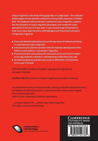 Corpus linguistics is the study of language data on a large scale - the computer-aided analysis of very extensive collections of transcribed utterances or written texts. This textbook outlines the basic methods of corpus linguistics, explains how the discipline of corpus linguistics developed and surveys the major approaches to the use of corpus data. It uses a broad range of examples to show how corpus data has led to methodological and theoretical innovation in linguistics in general. Clear and detailed explanations lay out the key issues of method and theory in contemporary corpus linguistics. A structured and coherent narrative links the historical development of the field to current topics in 'mainstream' linguistics. Practical tasks and questions for discussion at the end of each chapter encourage students to test their understanding of what they have read and an extensive glossary provides easy access to definitions of technical terms used in the text.