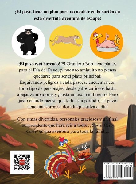 ¡El pavo tiene un plan para escapar de la sartén en esta aventura de Acción de Gracias! Corre, Pavo, Corre de Mare Robbins es una divertida aventura de Acción de Gracias llena de rimas ingeniosas, personajes inolvidables, y el épico viaje de un pavo que intenta escapar de la mesa de Acción de Gracias. Cuando el Pavo escucha al granjero Bob planear su destino como el plato principal, ¡sabe que debe actuar rápido! Con cada escondite, desde una cueva oscura hasta una colmena zumbante, el Pavo se enfrenta a una serie de desventuras cómicas, una tras otra. En el camino, el Pavo se encuentra con un grupo de animales vivaces, cada uno de los cuales le advierte "¡Corre, Pavo, corre!" Pero por mucho que lo intente, parece que la suerte del Pavo se está agotando-¡hasta que una sorpresa dorada lo convierte en la estrella de Acción de Gracias! Una historia entrañable con un toque de humor y suspenso, Corre, Pavo, Corre celebra el ingenio, los héroes improbables y el espíritu de gratitud. Perfecto para leer en familia, ¡este cuento se convertirá en un favorito de las fiestas para niños de 3 a 8 años!