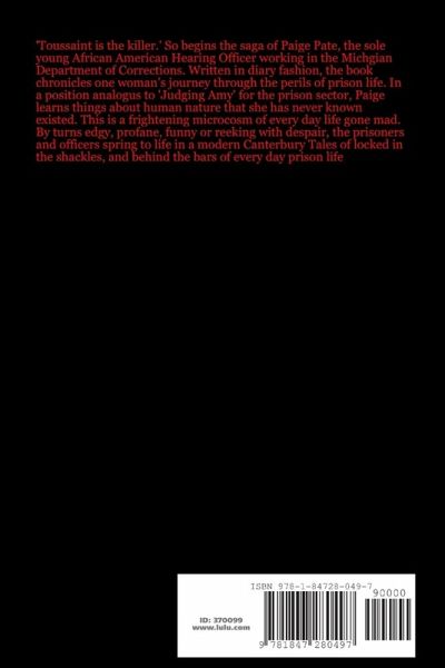'Toussaint is the killer.' So begins the saga of Paige Pate, the sole young African American Hearing Officer working in the Michigan Department of Corrections. Written in diary fashion, the book chronicles one woman's journey through the perils of prison life. In a position analogus to 'Judging Amy' for the prison sector, Paige learns things about human nature that she has never known existed. This is a frightening microcosm of every day life gone mad. By turns edgy, profane, funny or reeking with despair, the prisoners and officers spring to life in a modern Canterbury Tales of locked in the shackles, and behind the bars of every day prison life.