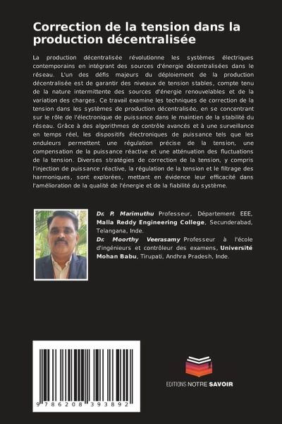 La production décentralisée révolutionne les systèmes électriques contemporains en intégrant des sources d'énergie décentralisées dans le réseau. L'un des défis majeurs du déploiement de la production décentralisée est de garantir des niveaux de tension stables, compte tenu de la nature intermittente des sources d'énergie renouvelables et de la variation des charges. Ce travail examine les techniques de correction de la tension dans les systèmes de production décentralisée, en se concentrant sur le rôle de l'électronique de puissance dans le maintien de la stabilité du réseau. Grâce à des algorithmes de contrôle avancés et à une surveillance en temps réel, les dispositifs électroniques de puissance tels que les onduleurs permettent une régulation précise de la tension, une compensation de la puissance réactive et une atténuation des fluctuations de la tension. Diverses stratégies de correction de la tension, y compris l'injection de puissance réactive, la régulation de la tension et le filtrage des harmoniques, sont explorées, mettant en évidence leur efficacité dans l'amélioration de la qualité de l'énergie et de la fiabilité du système.