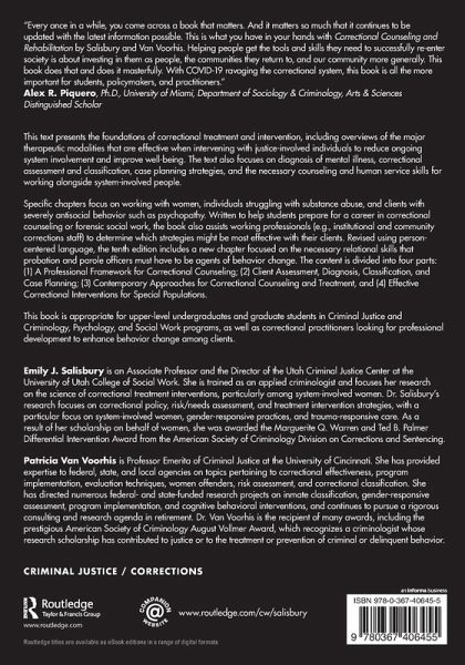 Emily J. Salisbury, Ph.D., is an Associate Professor and the Director of the Utah Criminal Justice Center at the University of Utah College of Social Work. She is trained as an applied criminologist and focuses her research on the science of correctional treatment interventions, particularly among system-involved women. The Utah Criminal Justice Center is an interdisciplinary research center that provides organizations with research, training, and technical assistance grounded in scientific evidence to prevent and reduce crime and victimization among all communities, with an understanding that approaches must be tailored to the contextual needs of organizations and the diverse populations they serve. Dr. Salisbury's research focuses on correctional policy, risk/needs assessment, and treatment intervention strategies, with a particular focus on system-involved women, gender-responsive practices, and trauma-responsive care. As a result of her scholarship on behalf of women, she was awarded the Marguerite Q. Warren and Ted B. Palmer Differential Intervention Award from the American Society of Criminology Division on Corrections and Sentencing. Patricia Van Voorhis, Ph.D., is Professor Emerita of Criminal Justice at the University of Cincinnati. Dr. Van Voorhis has published extensively, including two books and many articles in the leading criminology and criminal justice journals. She has provided expertise to federal, state, and local agencies on topics pertaining to correctional effectiveness, program implementation, evaluation techniques, women offenders, risk assessment, and correctional classification. She has directed numerous federal- and state-funded research projects on inmate classification, gender-responsive assessment, program implementation, and cognitive behavioral interventions, and continues to pursue a rigorous consulting and research agenda in retirement. Dr. Van Voorhis is the recipient of many awards, including the prestigious American Society of Criminology August Vollmer Award, which recognizes a criminologist whose research scholarship has contributed to justice or to the treatment or prevention of criminal or delinquent behavior.