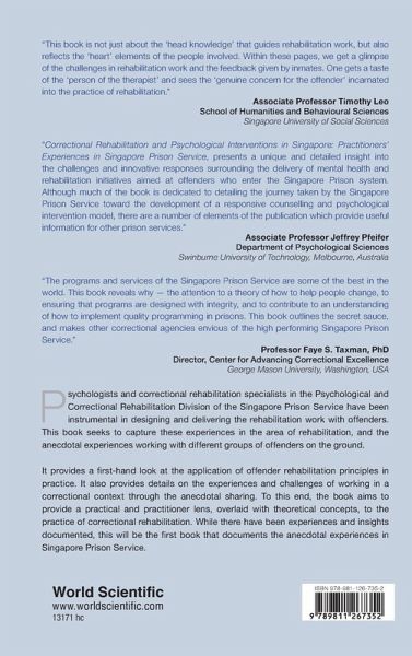 Psychologists and correctional rehabilitation specialists in the Psychological and Correctional Rehabilitation Division of the Singapore Prison Service have been instrumental in designing and delivering the rehabilitation work with offenders. This book seeks to capture these experiences in the area of rehabilitation, and the anecdotal experiences working with different groups of offenders on the ground. It provides a first-hand look at the application of offender rehabilitation principles in practice. It also provides details on the experiences and challenges of working in a correctional context through the anecdotal sharing. To this end, the book aims to provide a practical and practitioner lens, overlaid with theoretical concepts, to the practice of correctional rehabilitation. While there have been experiences and insights documented, this will be the first book that documents the anecdotal experiences in Singapore Prison Service.