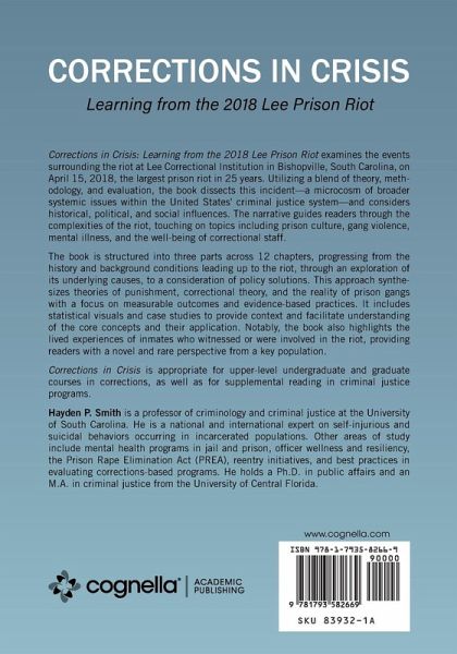 Corrections in Crisis: Learning from the 2018 Lee Prison Riot examines the events surrounding the riot at Lee Correctional Institution in Bishopville, South Carolina, on April 15, 2018, the largest prison riot in 25 years. Utilizing a blend of theory, methodology, and evaluation, the book dissects this incident-a microcosm of broader systemic issues within the United States' criminal justice system-and considers historical, political, and social influences. The narrative guides readers through the complexities of the riot, touching on topics including prison culture, gang violence, mental illness, and the well-being of correctional staff. The book is structured into three parts across 12 chapters, progressing from the history and background conditions leading up to the riot, through an exploration of its underlying causes, to a consideration of policy solutions. This approach synthesizes theories of punishment, correctional theory, and the reality of prison gangs with a focus on measurable outcomes and evidence-based practices. It includes statistical visuals and case studies to provide context and facilitate understanding of the core concepts and their application. Notably, the book also highlights the lived experiences of inmates who witnessed or were involved in the riot, providing readers with a novel and rare perspective from a key population. Corrections in Crisis is appropriate for upper-level undergraduate and graduate courses in corrections, as well as for supplemental reading in criminal justice