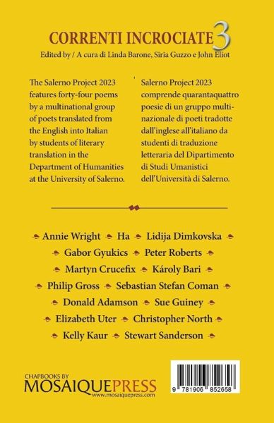 Correnti Incrociate (Cross-currents) is a bilingual poetry anthology inspired by the Erasmus+ cultural exchange programme. Poems appear in English and Italian, on facing pages, to enhance the reading experience.