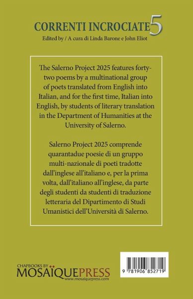 Correnti Incrociate 5 (Cross-currents) is the fifth in a series of bilingual poetry anthologies inspired by the European Union's Erasmus+ cultural exchange programme. Contemporary English and Italian poems, translated by students of literary translation at the University of Salerno, appear in the two languages on facing pages, to enrich the reading experience. Correnti Incrociate 5 è il quinto di una serie di antologie poetiche bilingue ispirate al programma di scambio culturale Erasmus+. Poesie contemporanee in inglese e italiano, tradotte da studenti di traduzione letteraria presso l'Università di Salerno, appaiono nelle due lingue su pagine affiancate, per arricchire l'esperienza di lettura.