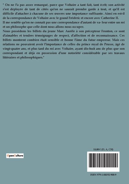 " On ne l'a pas assez remarqué, parce que Voltaire a tant fait, tant écrit; son activité s'est déployée de tant de côtés qu'on ne saurait prendre garde à tout, et qu'il est difficile d'attacher à chacune de ses ¿uvres une importance suffisante. Ainsi en est-il de la correspondance de Voltaire avec le grand Frédéric et encore avec Catherine II. Il me semble qu'on ne connaît pas une correspondance d'autant de va- leur entre un roi et un philosophe que celle dont nous allons nous occuper. Nous possédons les billets du jeune Marc Aurèle à son précepteur Fronton, ce sont d'aimables et tendres témoignages de respect, d'affection et de reconnaissance. Ces billets montrent combien était sensible et bonne l'âme du futur empereur. Mais ces relations ne pouvaient avoir l'importance de celles du prince royal de Prusse, âgé de vingt-quatre ans, et plus tard du roi avec Voltaire, ayant dix-huit ans de plus que son correspondant et déjà en possession d'une notoriété considérable par ses travaux littéraires et philosophiques."