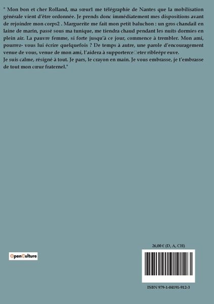 " Mon bon et cher Rolland, ma s¿ur1 me télégraphie de Nantes que la mobilisation générale vient d¿être ordonnée. Je prends donc immédiatement mes dispositions avant de rejoindre mon corps2 . Marguerite me fait mon petit baluchon : un gros chandail en laine de marin, passé sous ma tunique, me tiendra chaud pendant les nuits dormies en plein air. La pauvre femme, si forte jusqüà ce jour, commence à trembler. Mon ami, pourrez- vous lui écrire quelquefois ? De temps à autre, une parole d¿encouragement venue de vous, venue de mon ami, l¿aidera à supporterce¿eter ribleépr euve. Je suis calme,…mehr