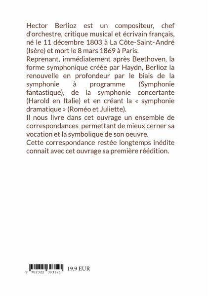 Hector Berlioz est un compositeur, chef d'orchestre, critique musical et écrivain français, né le 11 décembre 1803 à La Côte-Saint-André (Isère) et mort le 8 mars 1869 à Paris.Reprenant, immédiatement après Beethoven, la forme symphonique créée par Haydn, Berlioz la renouvelle en profondeur par le biais de la symphonie à programme (Symphonie fantastique), de la symphonie concertante (Harold en Italie) et en créant la « symphonie dramatique » (Roméo et Juliette).Il nous livre dans cet ouvrage un ensemble de correspondances permettant de mieux cerner sa vocation et la symbolique de son oeuvre. Cette correspondance restée longtemps inédite connait avec cet ouvrage sa première réédition.