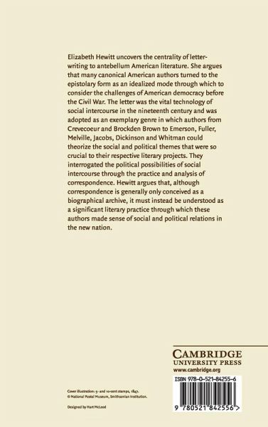 Elizabeth Hewitt uncovers the centrality of letter-writing to antebellum American literature. She argues that many canonical American authors turned to the epistolary form as an idealised genre through which to consider the challenges of American democracy before the Civil War. The letter was the vital technology of social intercourse in the nineteenth century and was adopted as an exemplary genre in which authors from Crevecoeur and Adams through Jefferson, to Emerson, Melville, Dickinson and Whitman, could theorise the social and political themes that were so crucial to their respective literary projects. They interrogated the political possibilities of social intercourse through the practice and analysis of correspondence. Hewitt argues that although correspondence is generally only conceived as a biographical archive, it must instead be understood as a significant genre through which these early authors made sense of social and political relations in the nation.