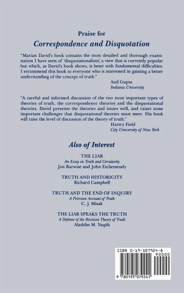 Marian David defends the correspondence theory of truth against the disquotational theory of truth, its current major rival. The correspondence theory asserts that truth is a philosophically rich and profound notion in need of serious explanation. Disquotationalists offer a radically deflationary account inspired by Tarski and propagated by Quine and others. They reject the correspondence theory, insist truth is anemic, and advance an "anti-theory" of truth that is essentially a collection of platitudes: "Snow is white" is true if and only if snow is white; "Grass is green" is true if and only if grass is green. According to disquotationalists, the only profound insight about truth is that it lacks profundity. David contrasts the correspondence theory with disquotationalism and then develops the latter position in rich detail - more than has been available in previous literature - to show its faults. He demonstrates that disquotationalism is not a tenable theory of truth, as it has too many absurd consequences.